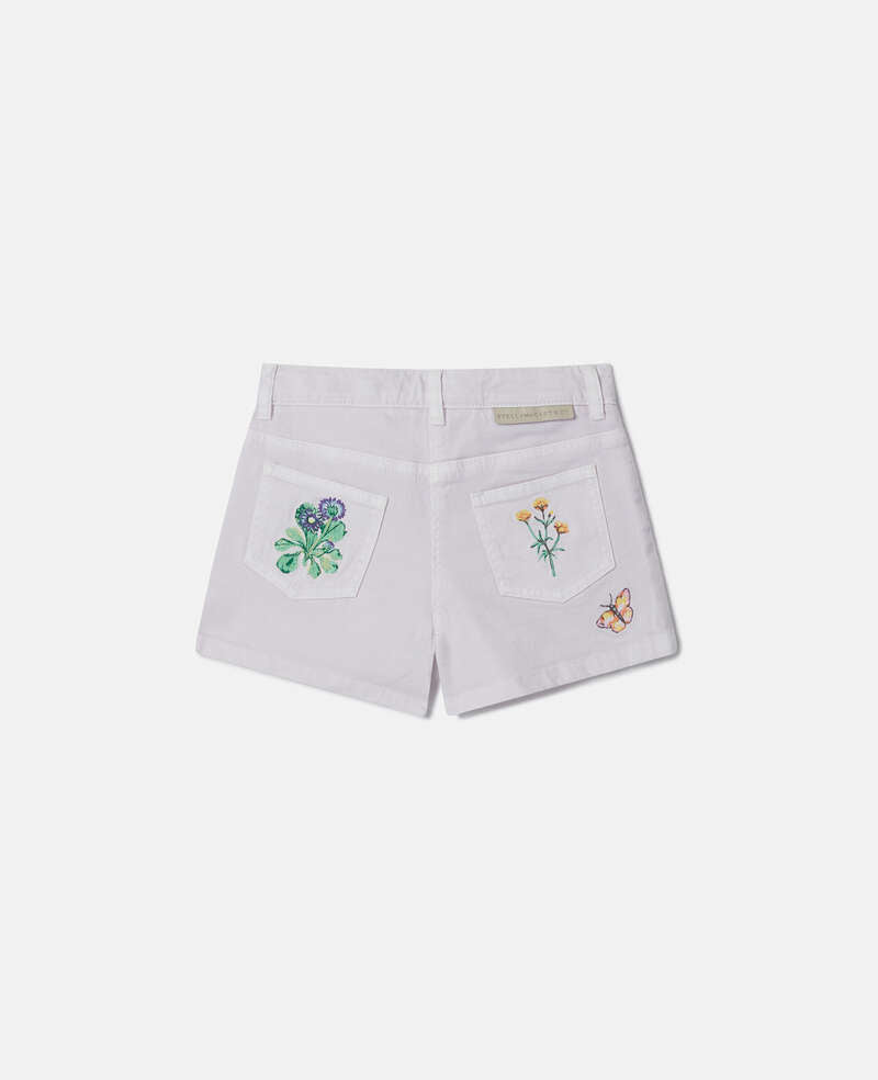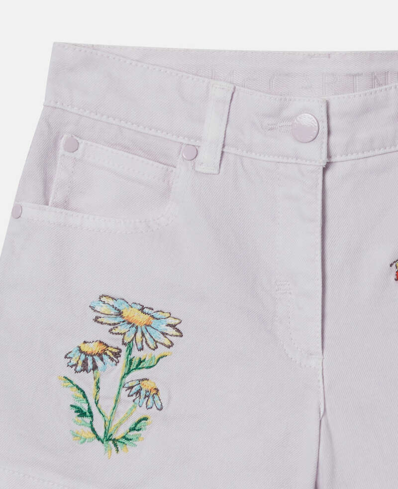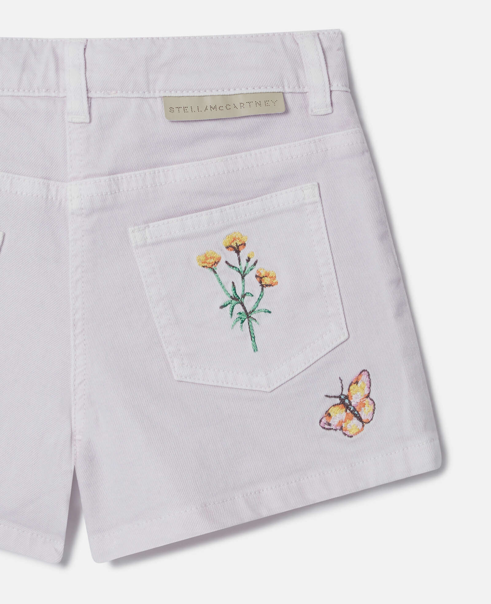 Jeansshorts i ljuslila/ljusrosa färg med broderier inspirerat av naturen som blommor, svampar och insekter.