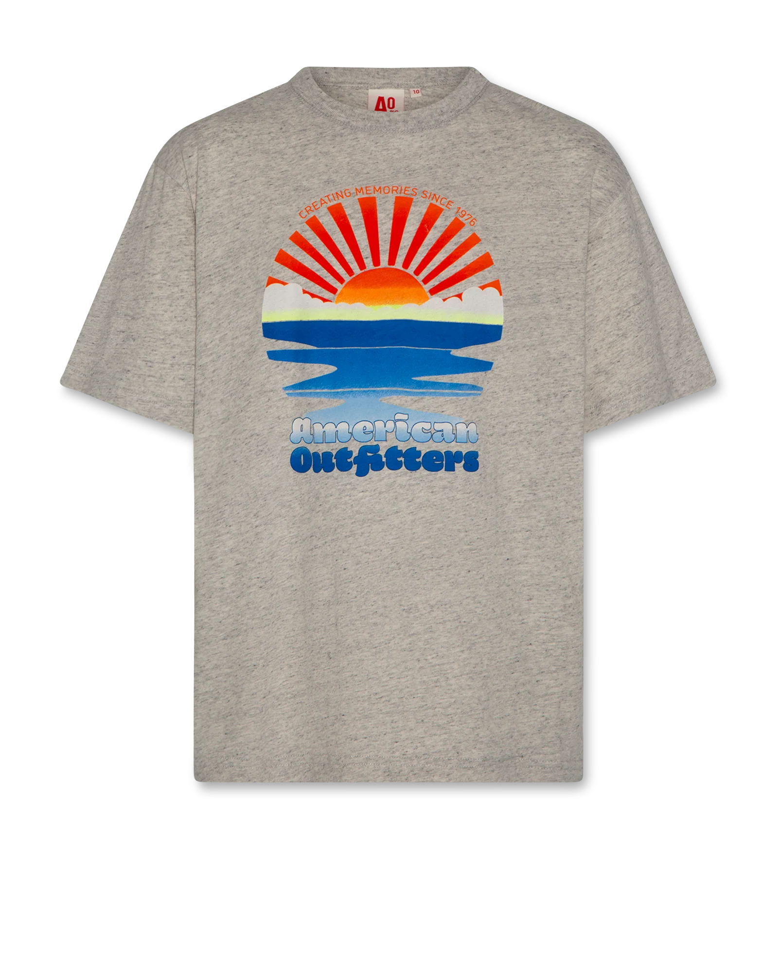 Mjuk bomullsT-shirt från AO76 i en något större modell för en mer relaxed look. Här i en härlig grå färg med tryck fram av en solnedgång i fler färger. Sommar!